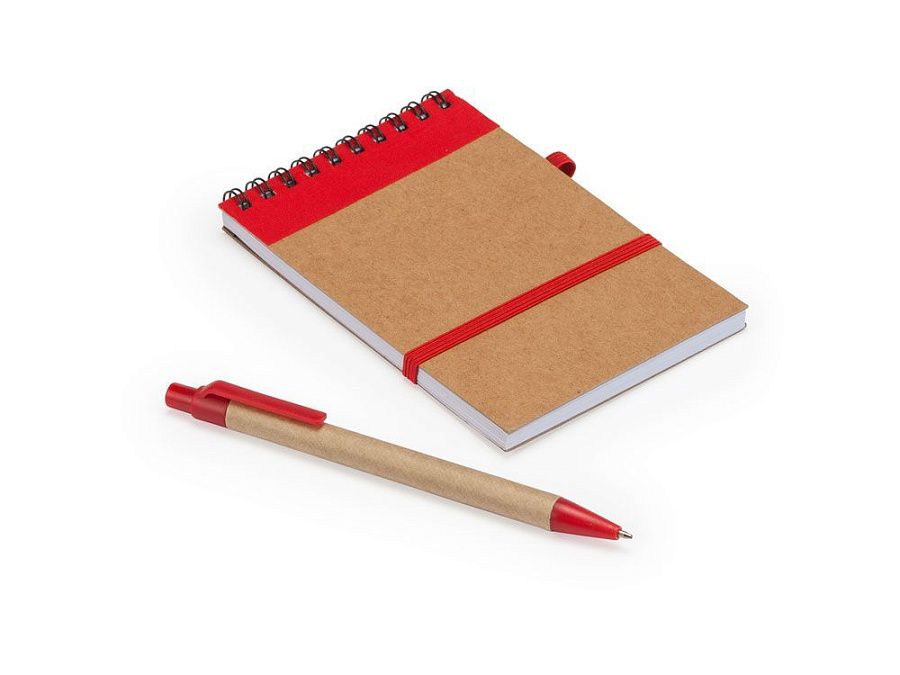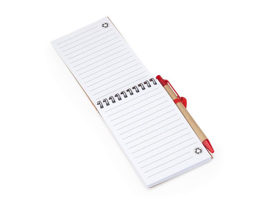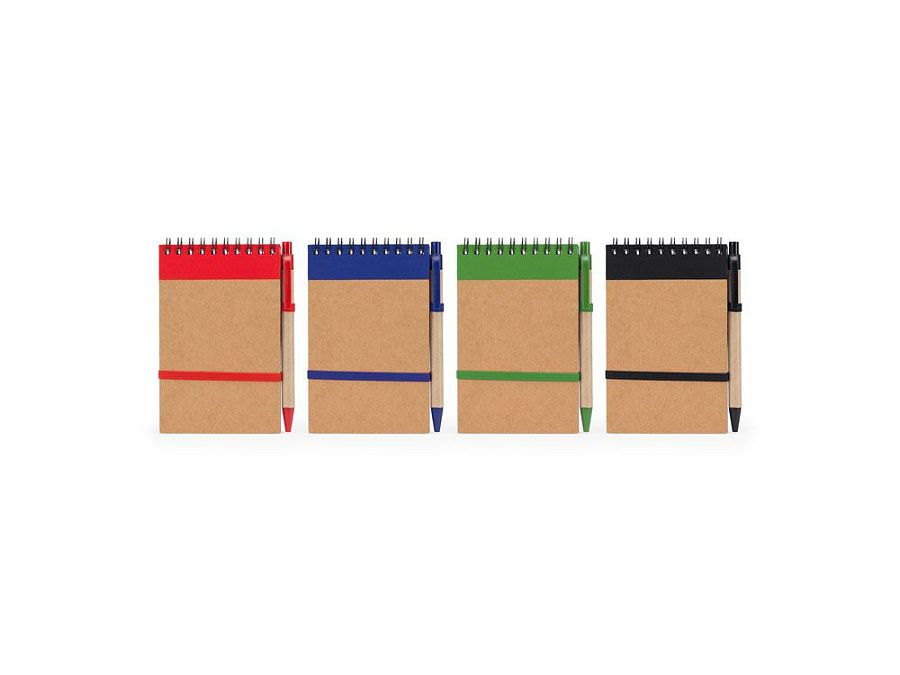 Блокнот на спирали с жесткой обложкой из переработанного картона. Включает шариковую ручку с синими чернилами. 70 листов.