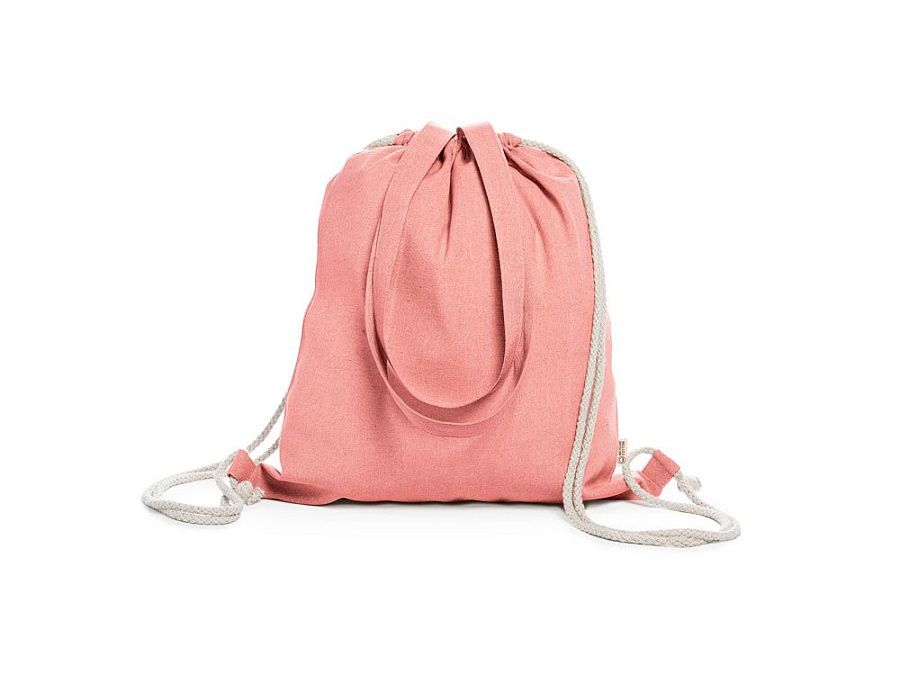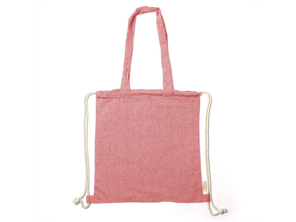 Рюкзак-мешок из переработанного хлопка плотностью 140 г/м² с меланжевой отделкой, ручками длиной 70 см в тон и шнурками натурального цвета.