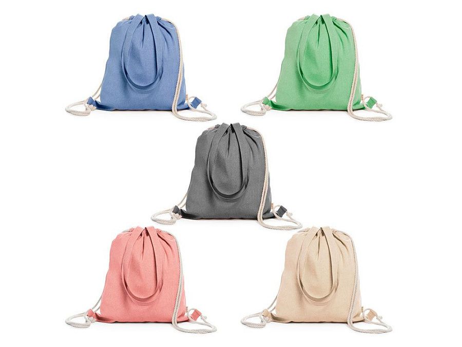Рюкзак-мешок из переработанного хлопка плотностью 140 г/м² с меланжевой отделкой, ручками длиной 70 см в тон и шнурками натурального цвета.