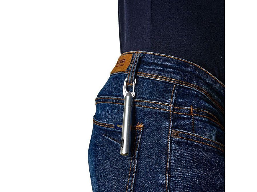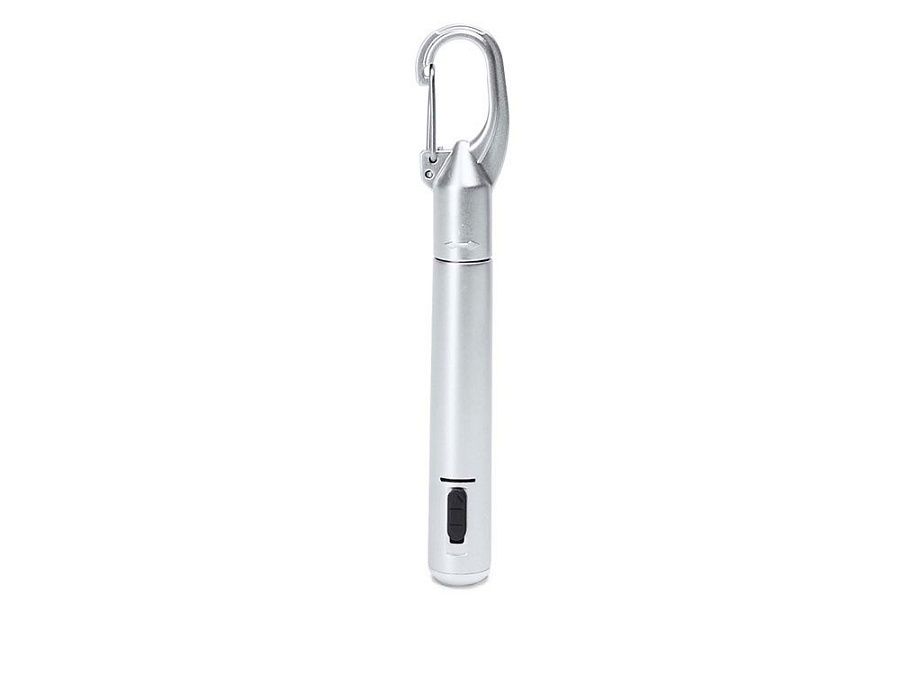 Ручка со светодиодным фонариком, доступна в различных цветах с металлическим покрытием и черной кнопкой. Встроенный карабин. Синие чернила