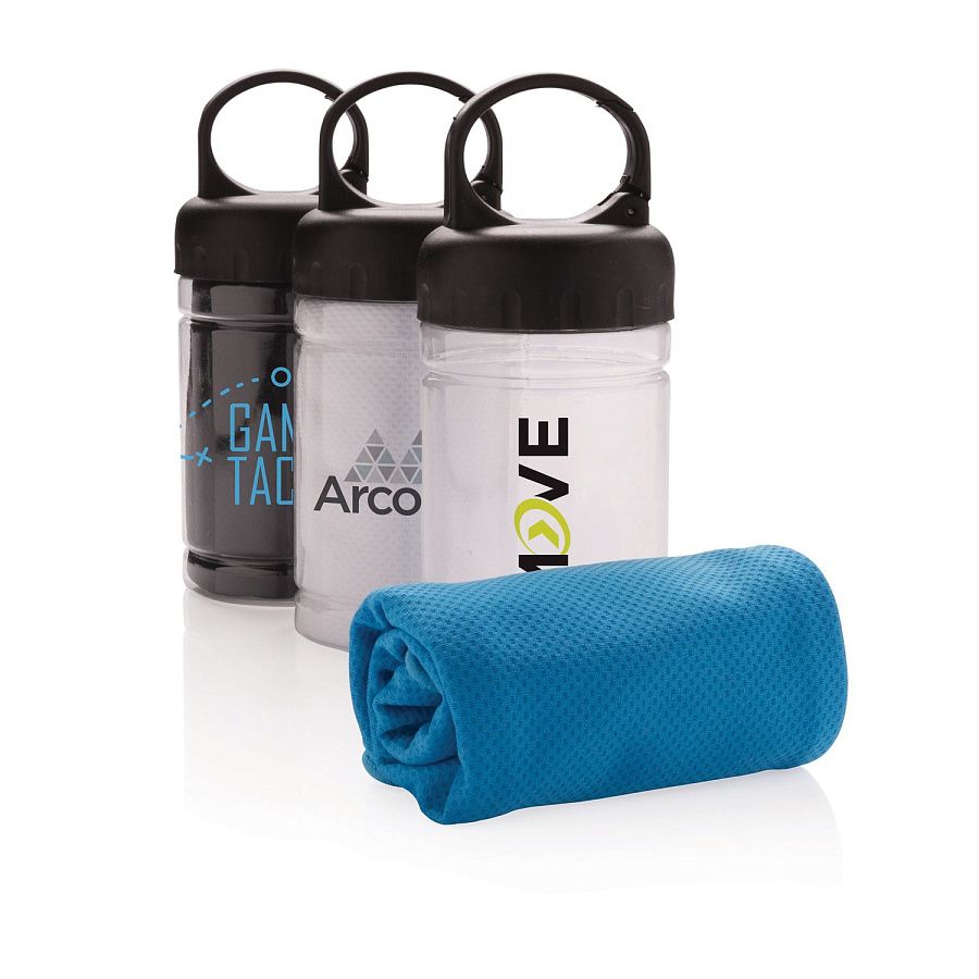 Полотенце Cooling из микрофибры с функцией защиты от ультрафиолетовых лучей (степень защиты 50+). Просто добавьте немного холодной воды в колбу, и охлажденное полотенце поможет вам оставаться на высоте даже в самый жаркий день. Колба изготовлена из PP с крышкой из ABS-пластика. Поставляется с карабином для крепления к рюкзаку.