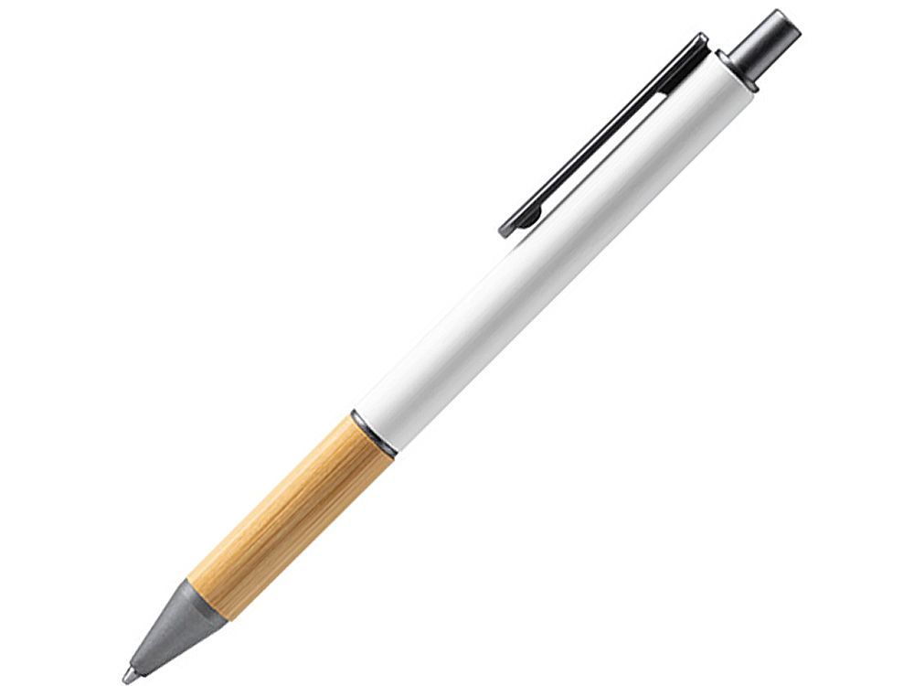 Металлическая шариковая ручка с матовым покрытием, бамбуковой вставкой и деталями темного цвета.