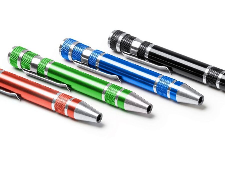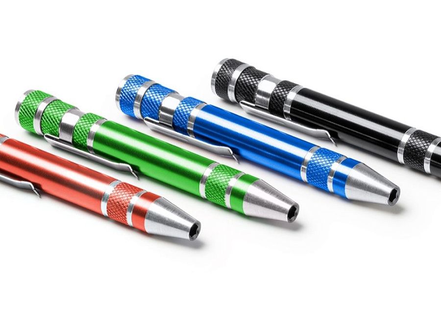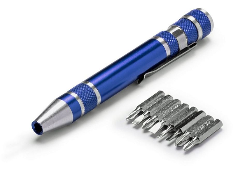 Алюминиевый мультитул в форме ручки. В комплекте 8 головок бит