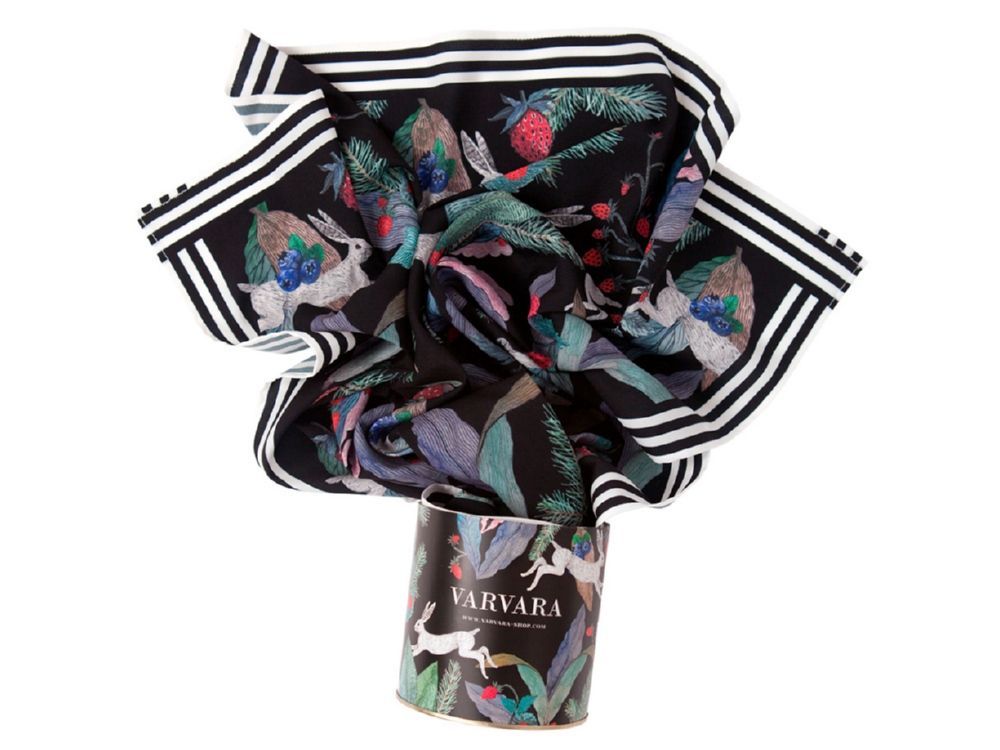 Принт нарисован художницей вручную специально для бренда Varvara. Художница размышляла на тему русской природы, культуры и искусства - тут и лесная земляника, и сочная зелень, и конечно, сказочные зайцы - как будто только что сошли с полотен В. Васнецова.