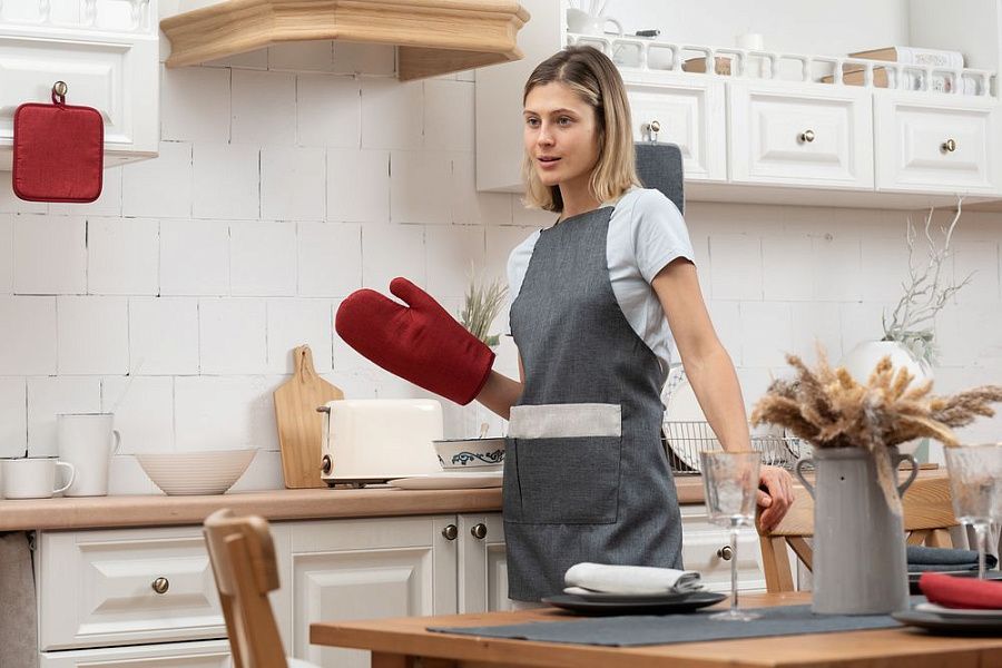 Износостойкая ткань, имитирующая лен, обработана пропиткой от грязи и воды, что делает ее применение для кухни и дома практичным, а уход — легким.