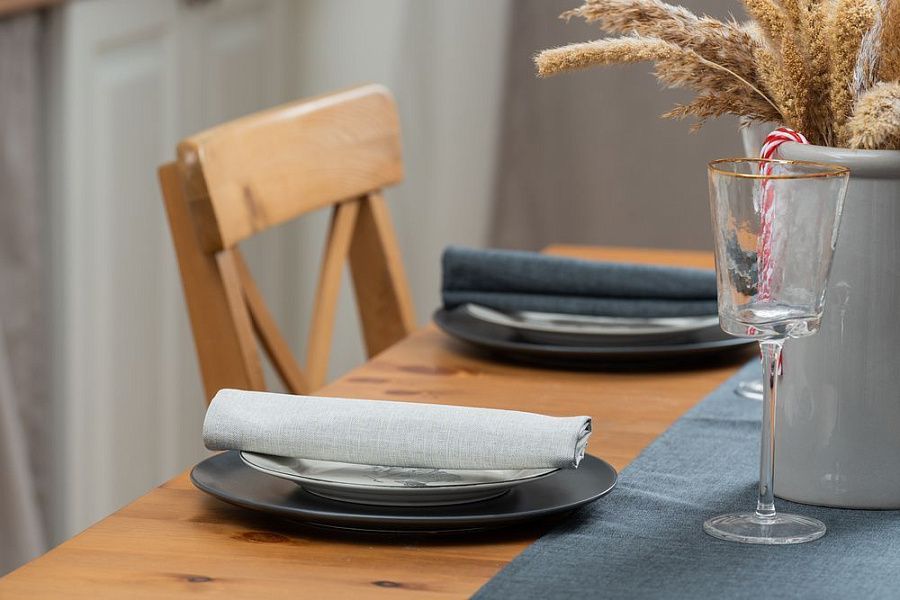 Износостойкая ткань, имитирующая лен, обработана пропиткой от грязи и воды, что делает ее применение для кухни и дома практичным, а уход — легким.