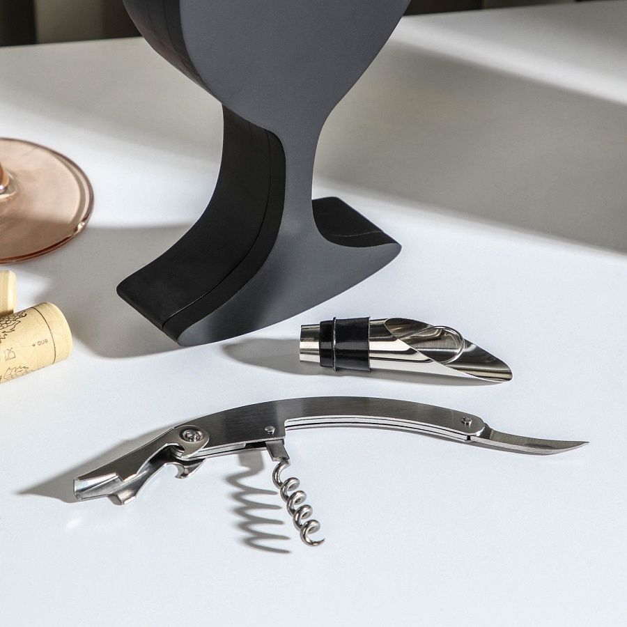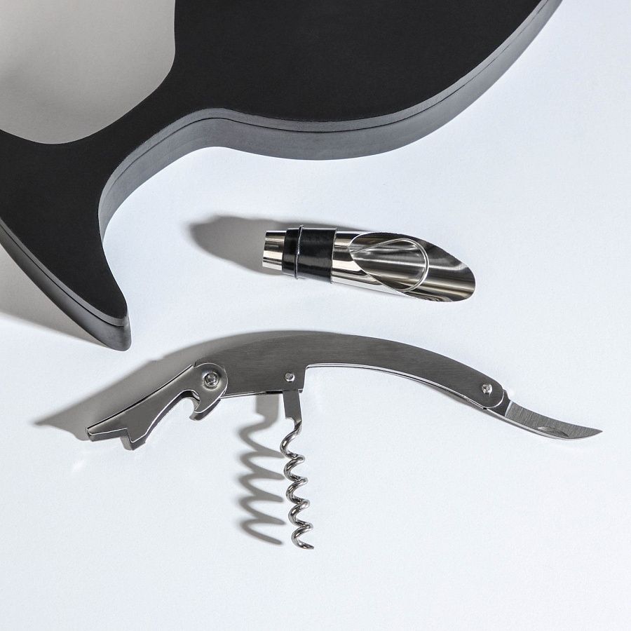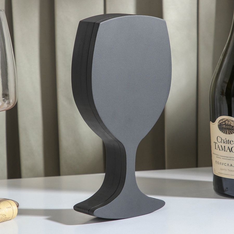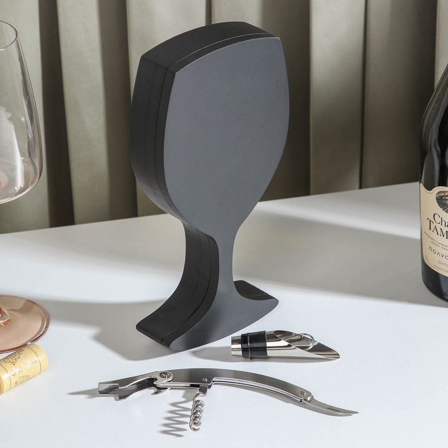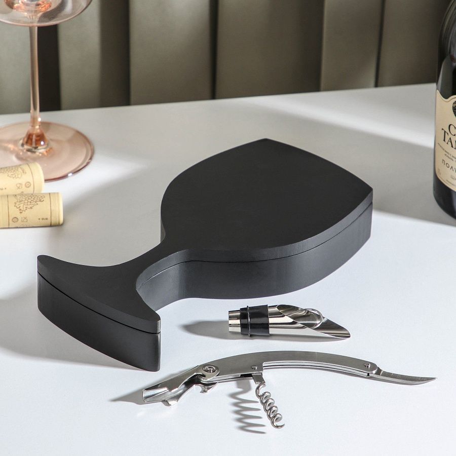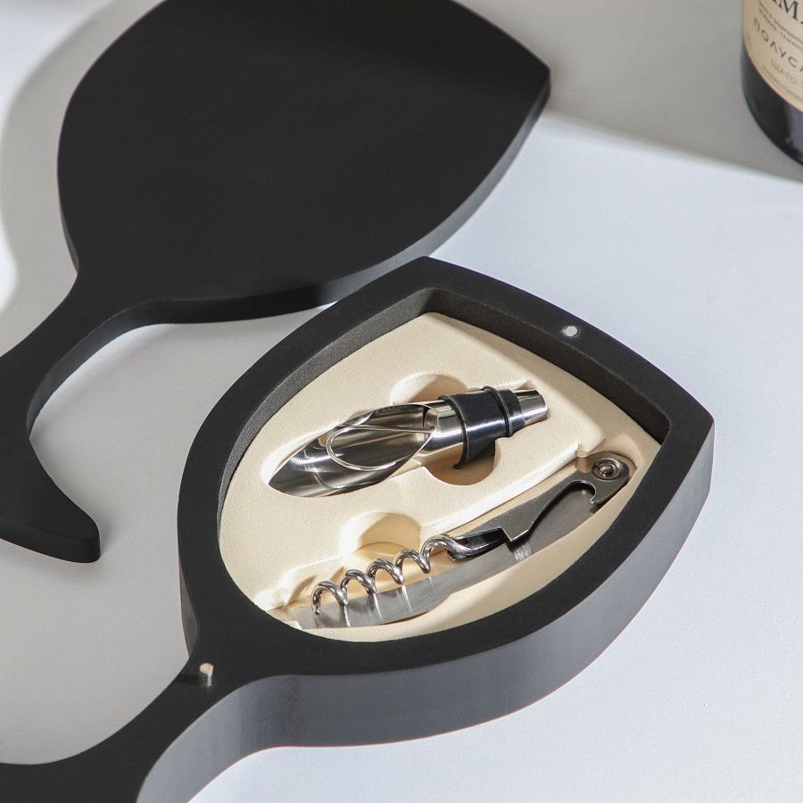 Штопор и каплеуловитель в деревянной коробке в форме бокала.