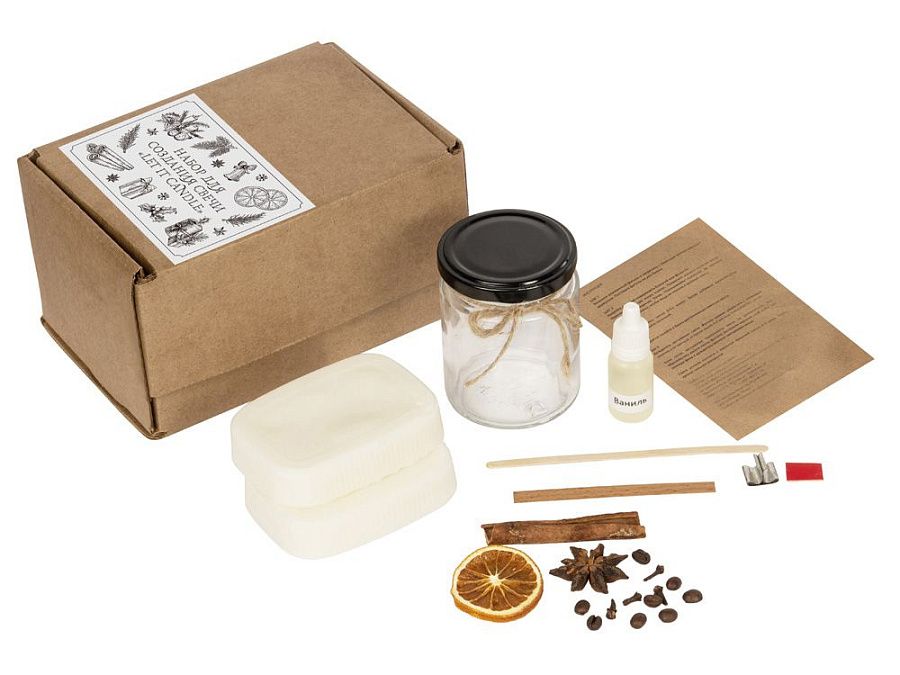 В набор входят сама свечная масса экологичного состава (соевый и кокосовый воск, пищевой парафин), стеклянная банка, деревянный фитиль и держатель, ванильный ароматизатор, специи и ленточка для декора.