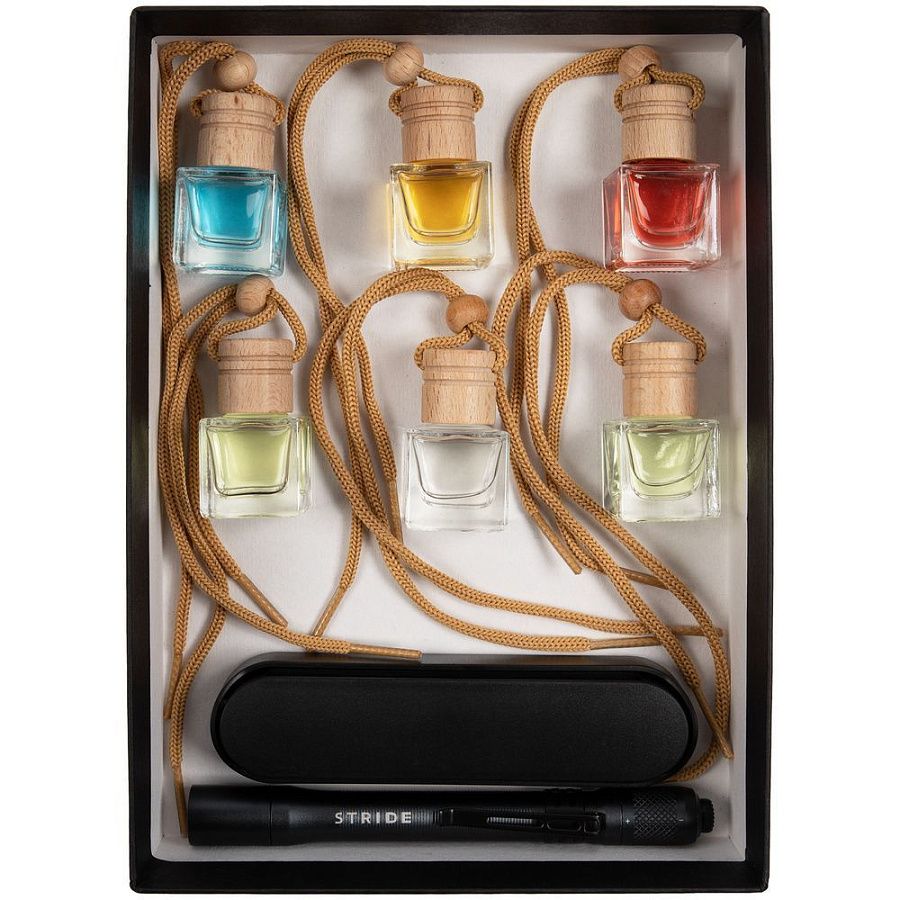 визитка - пластик; коробка - переплетный картон; фонарик - алюминий; ароматизатор - стекло, дерево