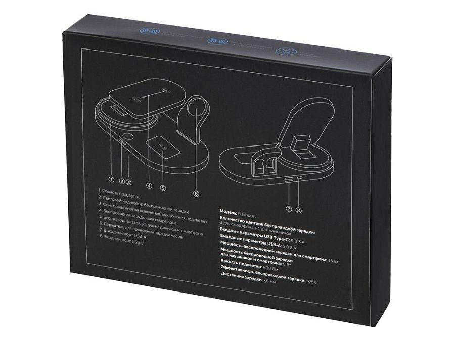 «Flashport» от Evolt - это складная зарядная станция с беспроводной зарядкой для телефона и наушников. В комплекте также идет подставка под зарядку для наручных смарт-часов. На регулируемой панели зарядки смартфона расположены 2 катушки (2 центра беспроводной зарядки), которые позволяют заряжать ваш девайс как в вертикальном, так и горизонтальном положении. Беспроводная зарядка для наушников мощностью 5 Вт подходит для зарядки не только беспроводных наушников, но и второго смартфона. Чтобы включить встроенную лампу, нажмите сенсорную кнопку 1 раз. Для плавного изменения яркости света нажмите и удерживайте сенсорную кнопку при включенной лампе. Кабель 100 см в комплекте.