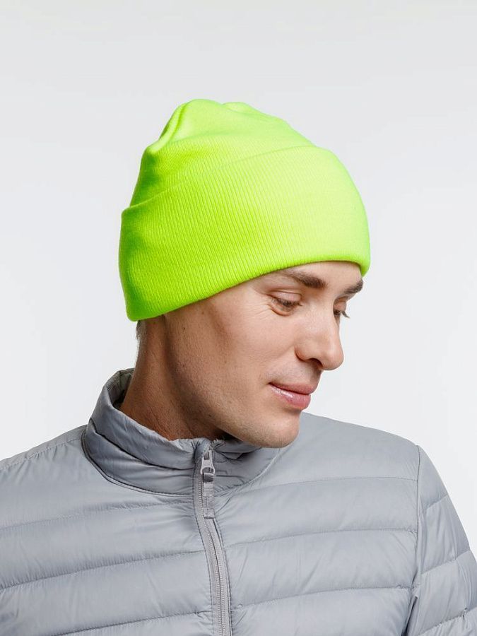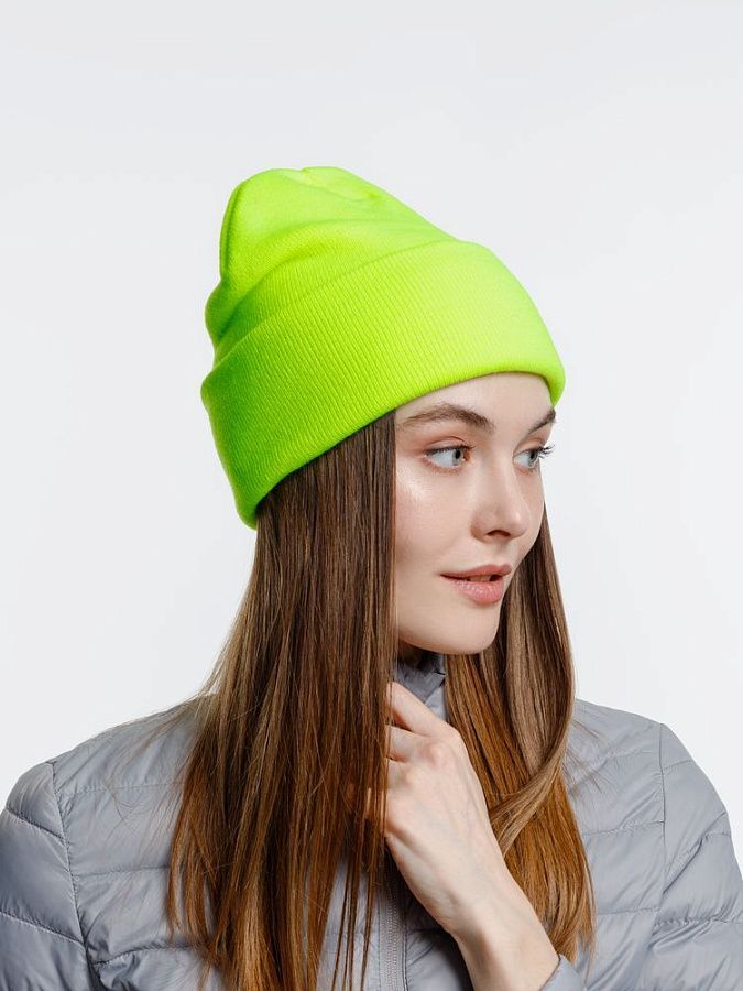 Двухслойная шапка из акриловой пряжи с регулируемым отворотом 7–10 см.