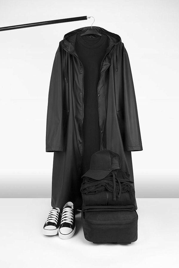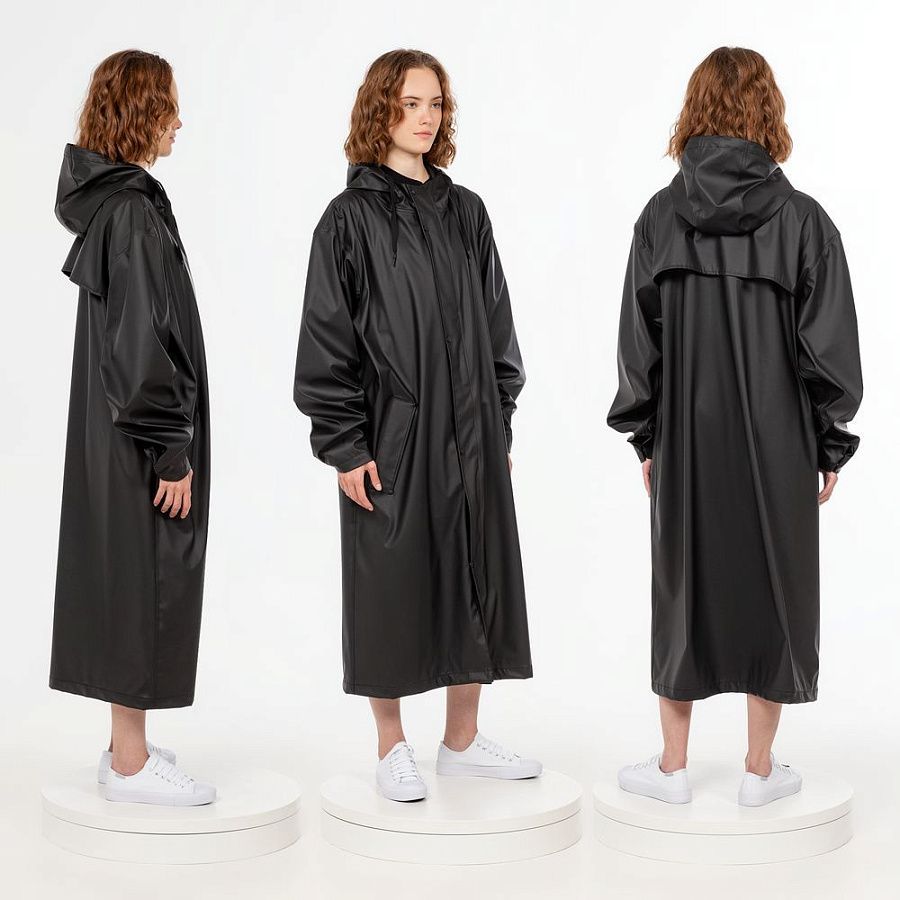 Плащ-дождевик с капюшоном из полиэстера с полиуретановым непромокаемым покрытием.