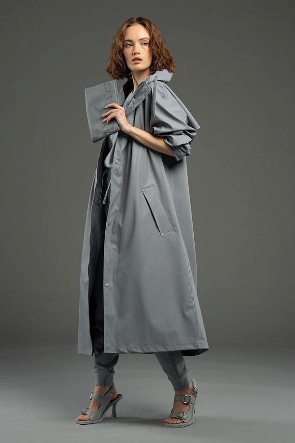 Плащ-дождевик с капюшоном из полиэстера с полиуретановым непромокаемым покрытием.