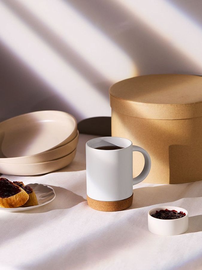 Яркий контраст текстурной пробки и матовой керамики делают кружку не только стильным, но и практичным подарком.