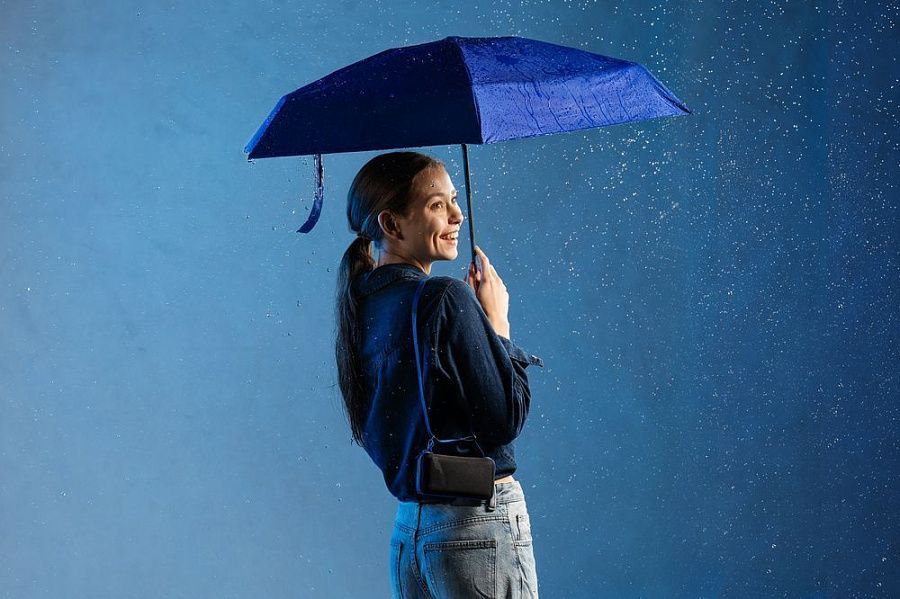 Миниатюрный зонт Color Action укроет от дождя или палящего солнца. Благодаря небольшим размерам и чехлу-кейсу на длинном ремешке его удобно брать с собой.
