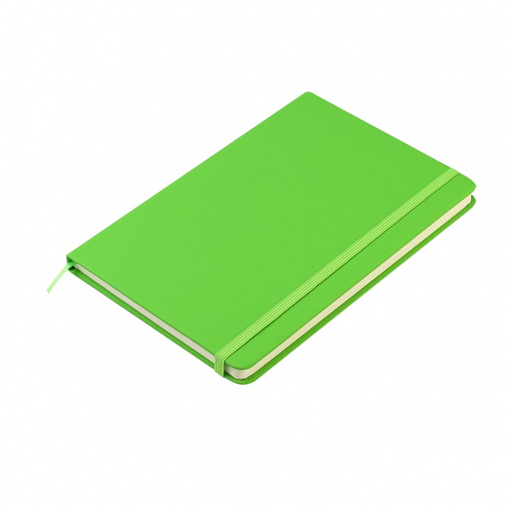 Блокнот формата А5 с твердым покрытием из PU-материала с имитацией рисунка кожи, с эластичной застежкой для закрытия и текстильной закладкой в цвет блокнота, 192 страницы / 96 листов, плотность 70г/м, страницы с черными линиями. Цвет по PANTONE® (максимально приближен): 3501C.
