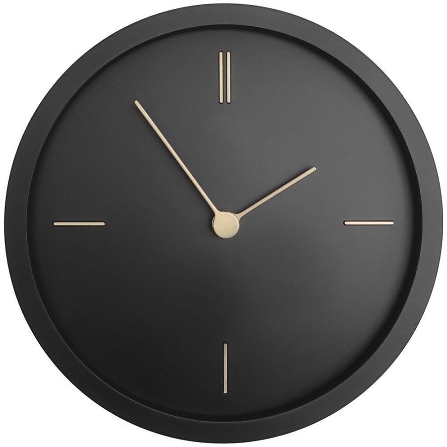 На круглом черном корпусе настенных часов Thelma выигрышно выделяются контрастные золотистые стрелки и тонкие линии часовых меток, создавая строгий и элегантный дизайн.