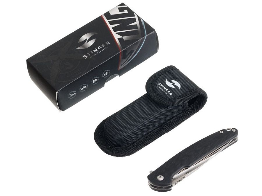 НОЖ СКЛАДНОЙ STINGER Повседневный складной нож из высококачественных материалов, идеально подойдет для решения большинства задач. Рукоять ножа изготовлена из стали с накладками из стеклотекстолита G10 - композитного материала на основе стеклоткани и эпоксидной смолы. G10 является прочным и ударостойким материалом, отлично переносит влагу, отличается повышенной стойкостью к огню. Рукоять ножа собрана на втулках - “бонках”, поэтому при необходимости его можно легко промыть. На рукояти расположено отверстие для темляка и клипса для удобного размещения ножа в кармане. Нож открывается при помощи флиппера с ассистом (механизм ускоренного открывания), который может дополнительно выполнять роль гарды, предотвращая соскальзывание руки на лезвие клинка. На верхней части лезвия расположен подпальцевый упор с насечкой для более комфортной работы. Клинок ножа произведен из высокоуглеродистой стали D2, которая пользуется большой популярностью в ножевой индустрии из-за исключительных технических и эксплуатационных параметров. Высокое содержание хрома (11%) и углерода (1,5%) в составе повышают коррозионную стойкость и ударную вязкость сплава, делают его достаточно твердым. D2 имеет твердость по шкале Роквелла в диапазоне 59-61 HRC, что делает ее одной из самых твердых сталей для ножей и позволяет лезвию держать остроту длительный период времени даже при интенсивном использовании. D2 отличается высокой прочностью, устойчивостью к износу и разрушению, что позволяет клинку выдерживать удары и нагрузки. Благодаря высокой твердости и прочности клинок из стали D2 имеет долгий срок службы, обеспечивает качественный и точный срез и не требует частой заточки. Характеристики: Материал клинка: высокоуглеродистая сталь D2 Твердость по шкале Роквелла: 59-61 HRC Материал рукояти: нержавеющая сталь/стеклотекстолит G10 Метод открывания клинка: флиппер с ассистом (механизм ускоренного открывания) Фиксатор клинка: Liner Lock Длина ножа: 187 мм Длина клинка: 81 мм Толщина клинка: 4 мм Вес: 100 г Цвет рукояти: черный Особенности: рукоять с клипом и отверстием под темляк В комплекте: нейлоновый чехол