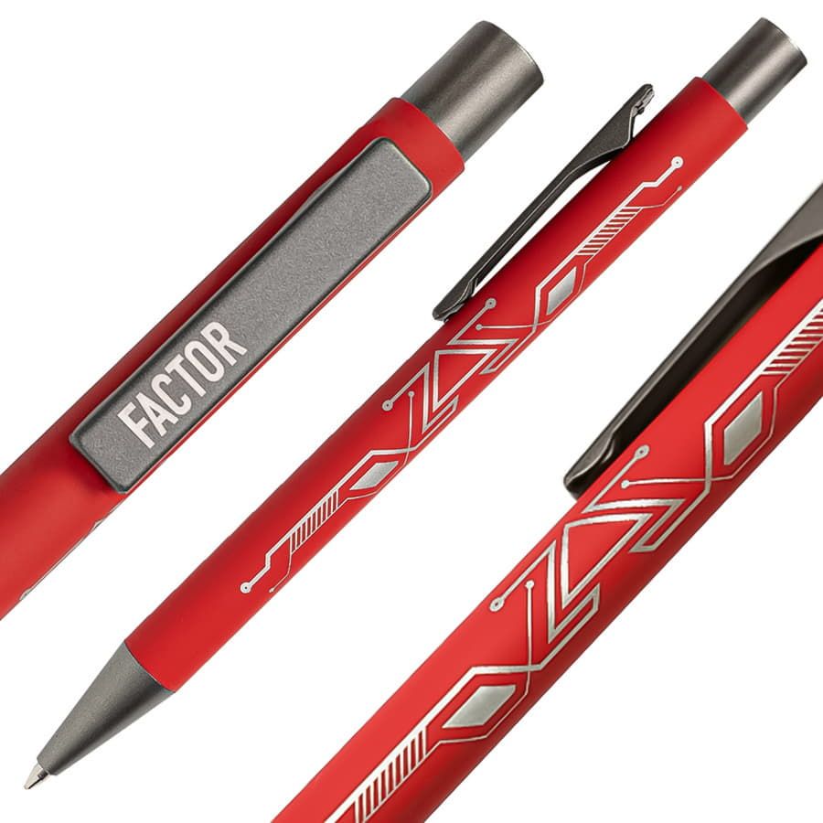 Модель ручки FACTOR – это оптимальный выбор для тех, кто предпочитает добротное качество, надежность и изящную простоту. Этой ручкой писать легко и удобно, она буквально скользит по бумаге благодаря качественным чернилам и надежному пишущему узлу. Все эти качества позволят ручке служить вам верой и правдой долгое время. А клип и корпус данной модели отлично подойдут для нанесения вашего логотипа. • Pantone, близкий к 200 С• Размер 140*10 мм• Корпус из алюминия с покрытием soft touch• Металлический клип-прищепка серого цвета • Пластиковые носик и кнопка в цвет клипа• Нажимной механизм подачи стержня• Пулевидный пишущий узел 1.0 мм• Длина линии письма 1000 м • Чернила Dokumental. Цвет чернил синий• Сменный стержень Parker type• При гравировке вскрывается натуральный цвет алюминия, который может быть либо более белый, либо более серого оттенка.Результат гравировки зависит от настроек оборудования!