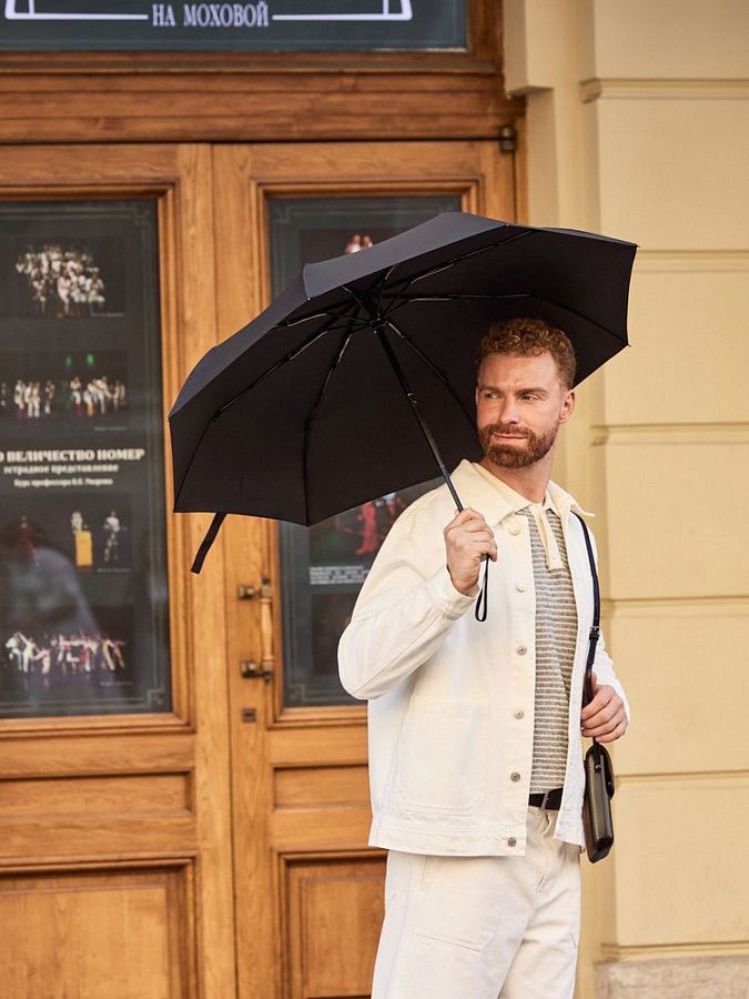 Черный купол и удобный механизм делают его незаменимым спутником в городе: от утреннего кофе до вечерних прогулок.
