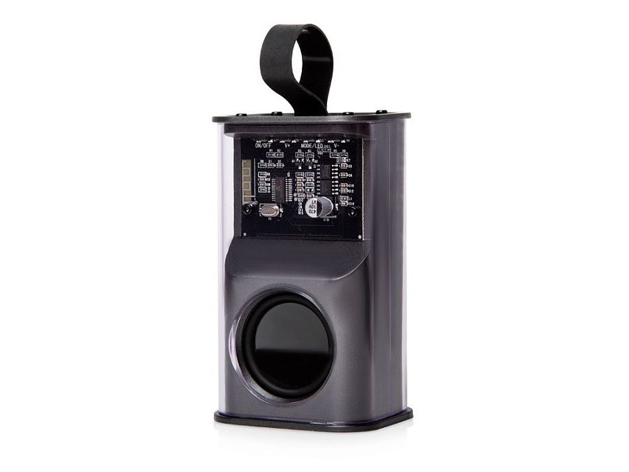 Колонка может работать от 3 до 5 часов на 1 заряде. Силиконовый держатель поможет подвесить колонку на карабин и закрепить на любой сумке, не занимая места внутри. Корпус выполнен из прозрачного пластика. Поставляется в фирменной упаковке.