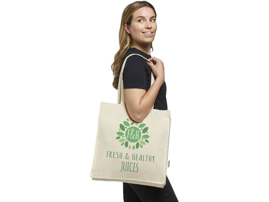 Эко-сумка Odessa, изготовленная из 100% переработанного хлопка, сертифицированного по стандарту GRS, создана для удобного ношения благодаря ручкам на плечо длиной 30 см и большому основному отделению с клинчиком. Независимо от того, хотите ли вы носить с собой тяжелые книги или продукты, эта сумка предназначена для удовлетворения любых потребностей. Методы печати, доступные для этой эко-сумки, также сертифицированы по стандарту GRS, что гарантирует прозрачность и сертификацию всей цепочки поставок. Хлопок плотностью 220 г/м² обеспечивает долговечность и надежность и позволяет переносить вес до 10 кг. Сделано в Индии. Recycled cotton, 220 g/m2.