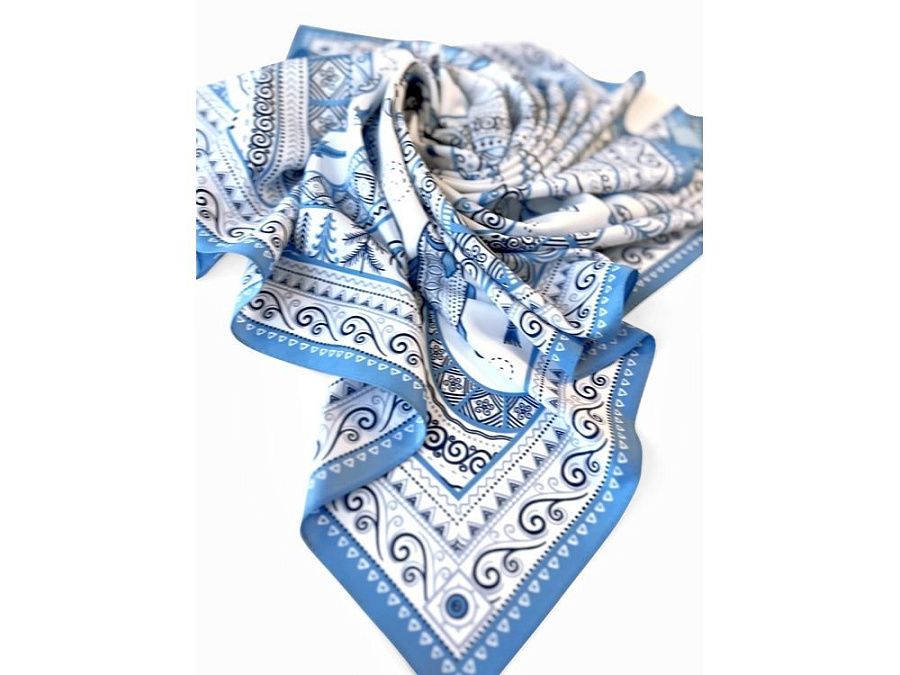 Платок из коллекции бренда "Русские в моде" посвящён уникальному искусству этой росписи. Изображения спиралевидных орнаментов в виде волн, елочек, рыбок украшают дизайн. Все это означает плодородие стихий земли и воды, энергию солнца, богатство и процветание.