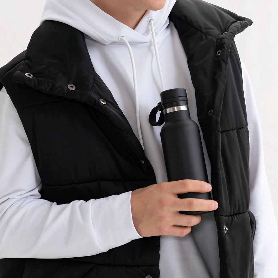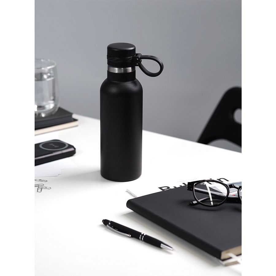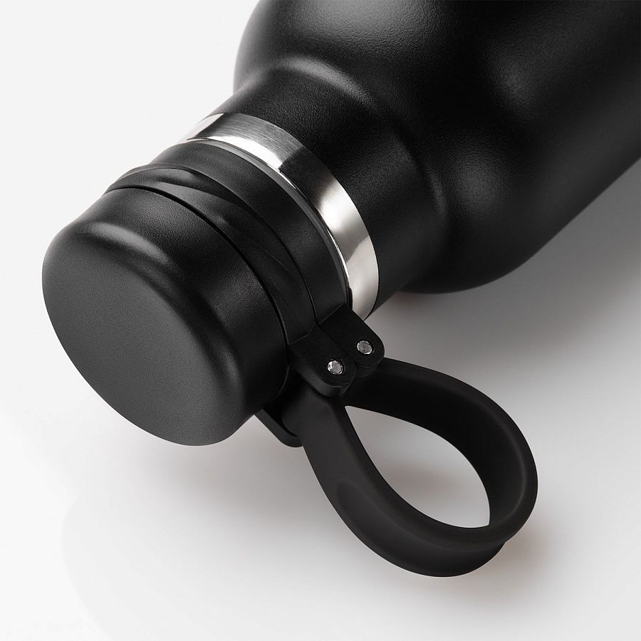 Вакуумная герметичная конструкция выполнена из двухслойной высоколегированной стали 304 марки, что делает конструкцию более прочной и устойчивой к мелким сколам и царапинам. Крышка из высококачественного пластика, оснащена удобной силиконовой петелькой для переноски. Бутылку можно переворачивать и класть в сумку.