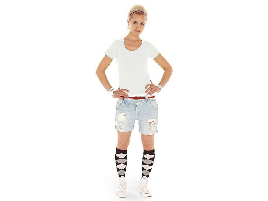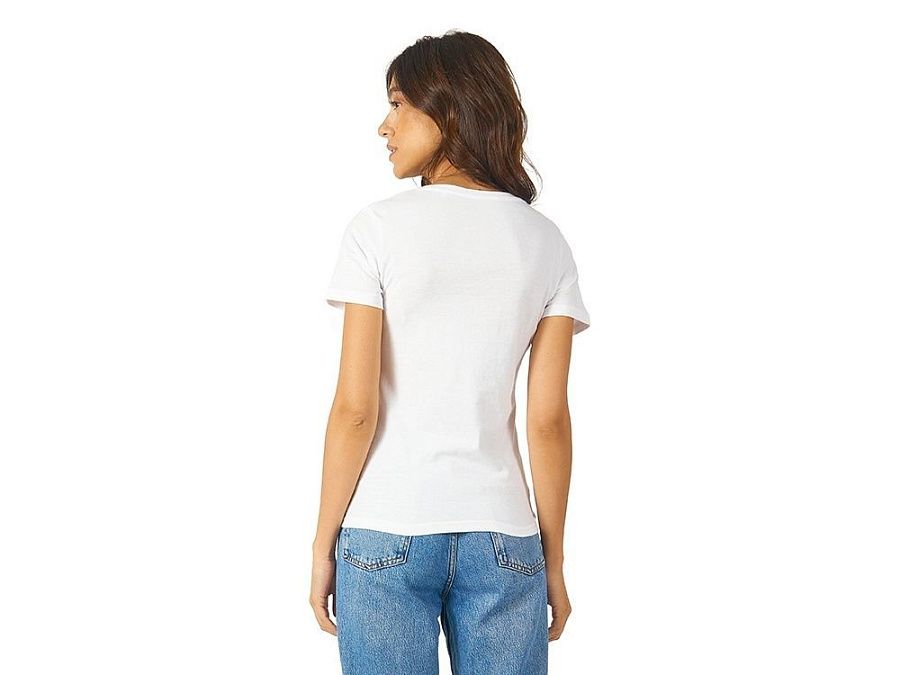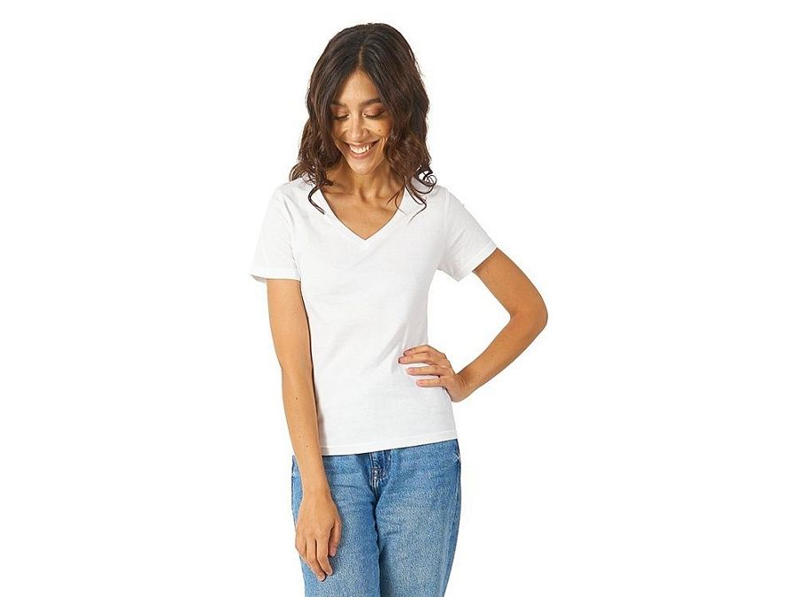 Женская футболка из натурального хлопка с элегантным V-образным вырезом. Материал отлично подходит для нанесения рекламной информации. Натуральная ткань не вызывает раздражения кожи.