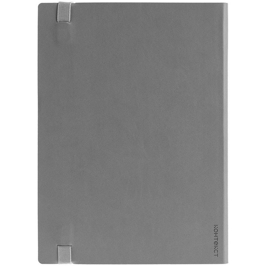 Ежедневник с гибкой обложкой выполнен из материала Latte, серый СС, и дополнен резинкой шириной 1 см, капталом и ляссе серого цвета.