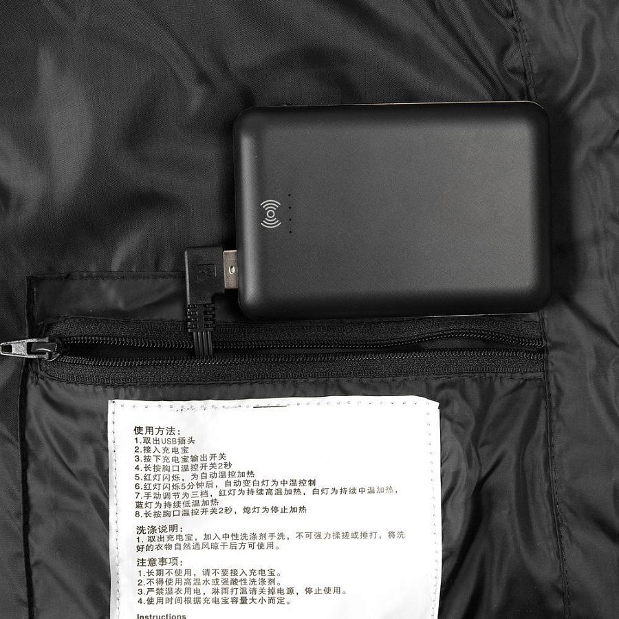 Жилет со встроенным нагревательным элементом из углеродного волокна с девятью зонами нагрева в области спины, шеи и живота. Работает от внешнего аккумулятора (в комплект не входит), подарит ощущение тепла и комфорта в любую погоду.