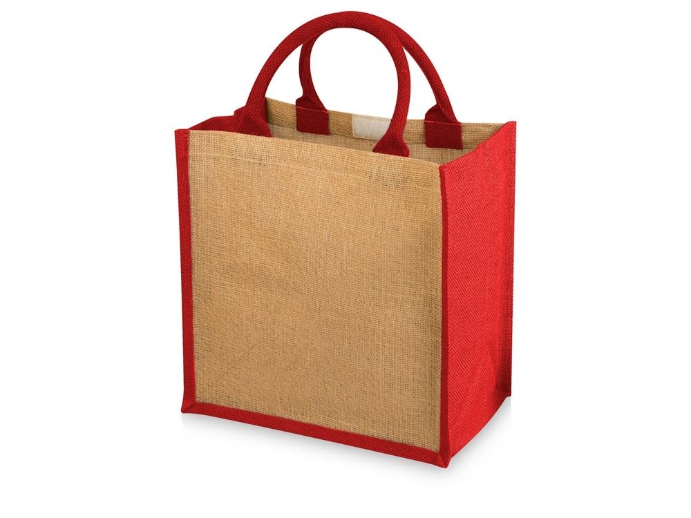 Джутовая подарочная сумка с ламинированным открытым основным отделением, которое застегивается на липучку. Хлопковые ручки высотой 11,5 см.