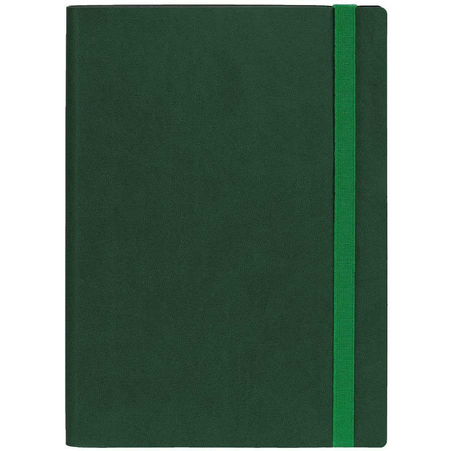 Ежедневник с гибкой обложкой выполнен из материала Latte, зеленый FF, и дополнен резинкой шириной 1 см, капталом и ляссе в цвет обложки.