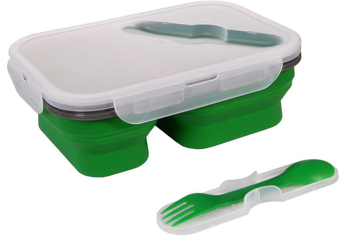 Герметичный выдвижной ящик из силикона и полипропилена с двумя отделениями емкостью до 480 мл и 760 мл. Вверху крышки находится штуцер со столовыми приборами (в комплекте) с функцией 2 в 1, вилкой и ложкой. Коробка подходит для микроволновой печи, крышка должна быть снята. 212 x 153 x 73 мм | Изгиб: 212 x 153 x 38 мм