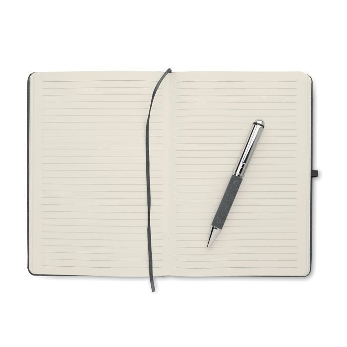 Подарочный набор: блокнот А5 в твердой обложке из переработанной кожи (75%) в переплете (160 линованных страниц (80 листов), эластичный ремешок, закладка и держатель для ручки) и металлическая ручка (синие чернила). Поставляется в крафтовой коробке. FSC®-certified | FSC MIX CREDIT, P7.1, FSC-C213206