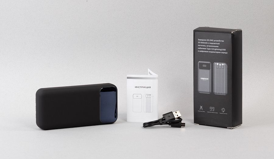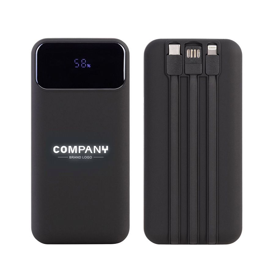 Быстрый зарядник с полезными удобными дополнительными опциями - встроенными кабелями и цифровой индикацией уровня оставшегося заряда в %. Супербонус - яркая персонализация в виде подсветки логотипа.