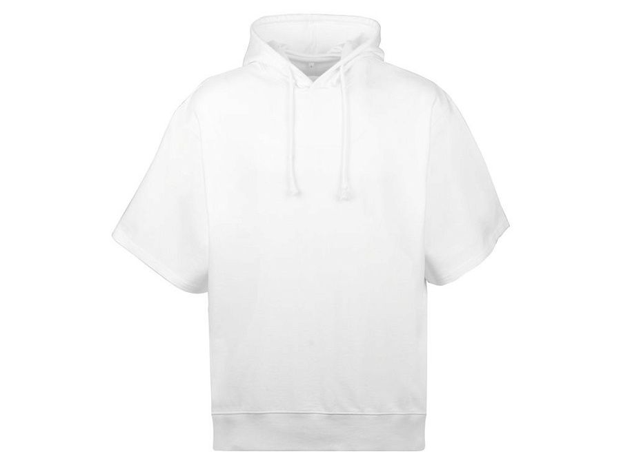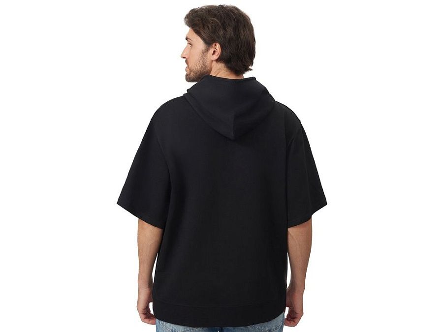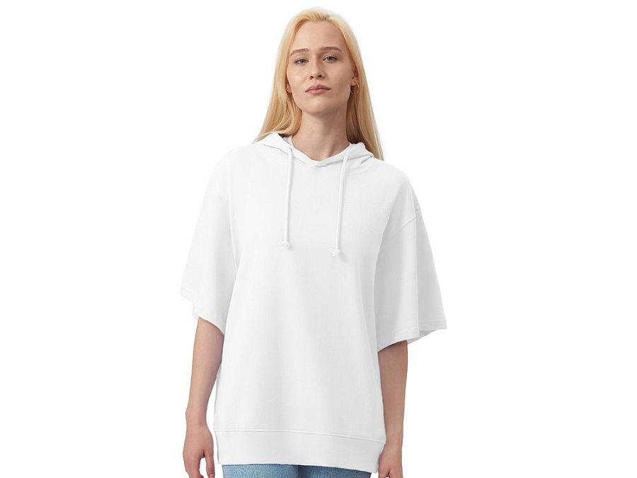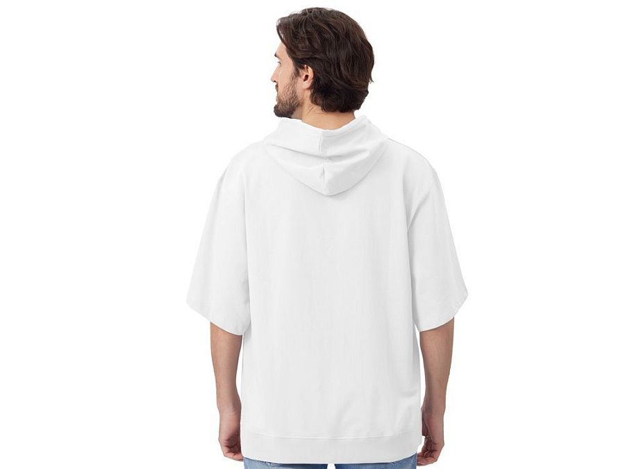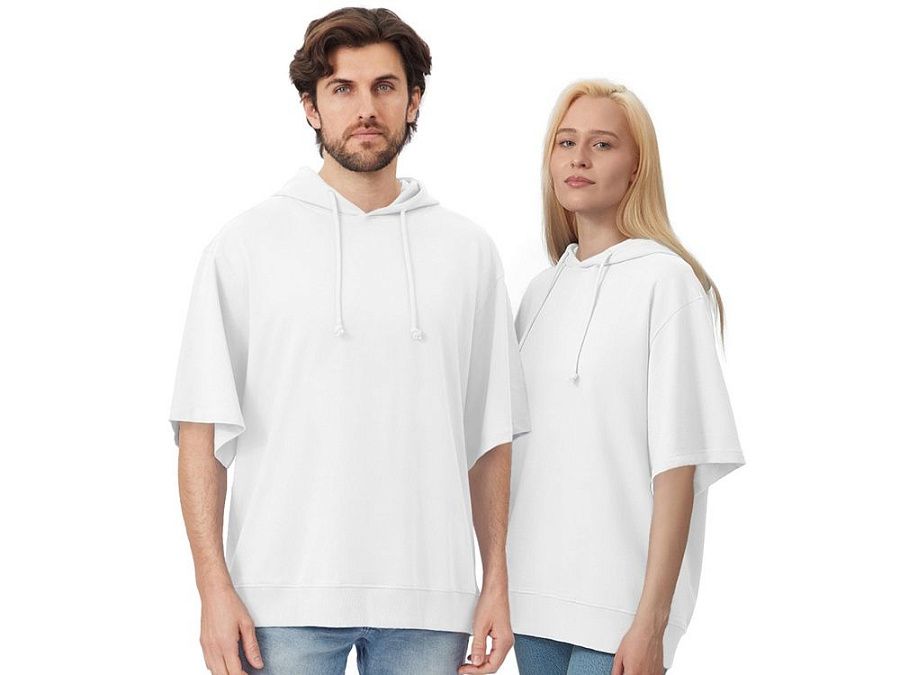 Худи с коротким рукавом выполнено из хлопкового френч терри с петельками на изнаночной стороне. Подкладка капюшона выполнена из основного полотна для объемной посадки. Модель комфортной и актуальной посадки оверсайз отлично подходит для обычной жизни и в качестве промо мерча. - оверсайз посадка - низ обработан рибом 2х2 и дополнительно отстрочен для укрепления - мягкое и качественное полотно френч терри - увеличенная зона для нанесения из-за отсутствия кармана