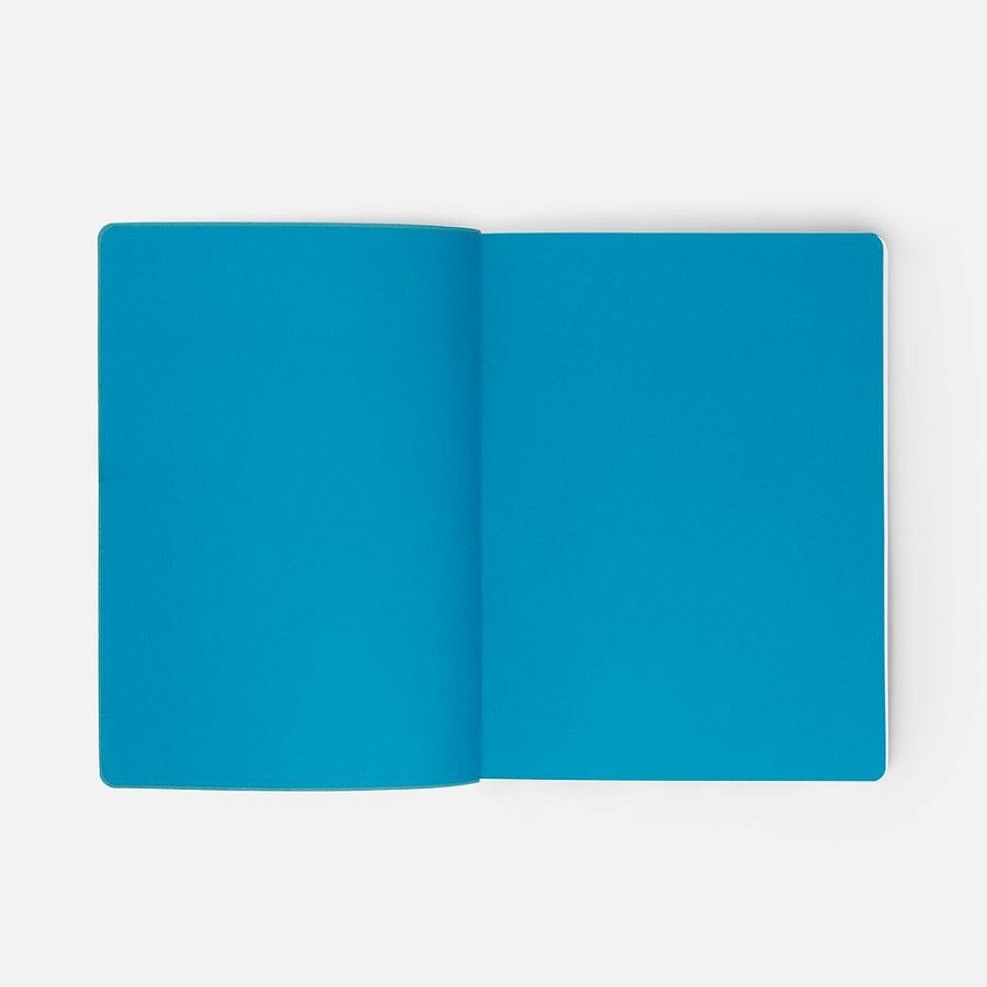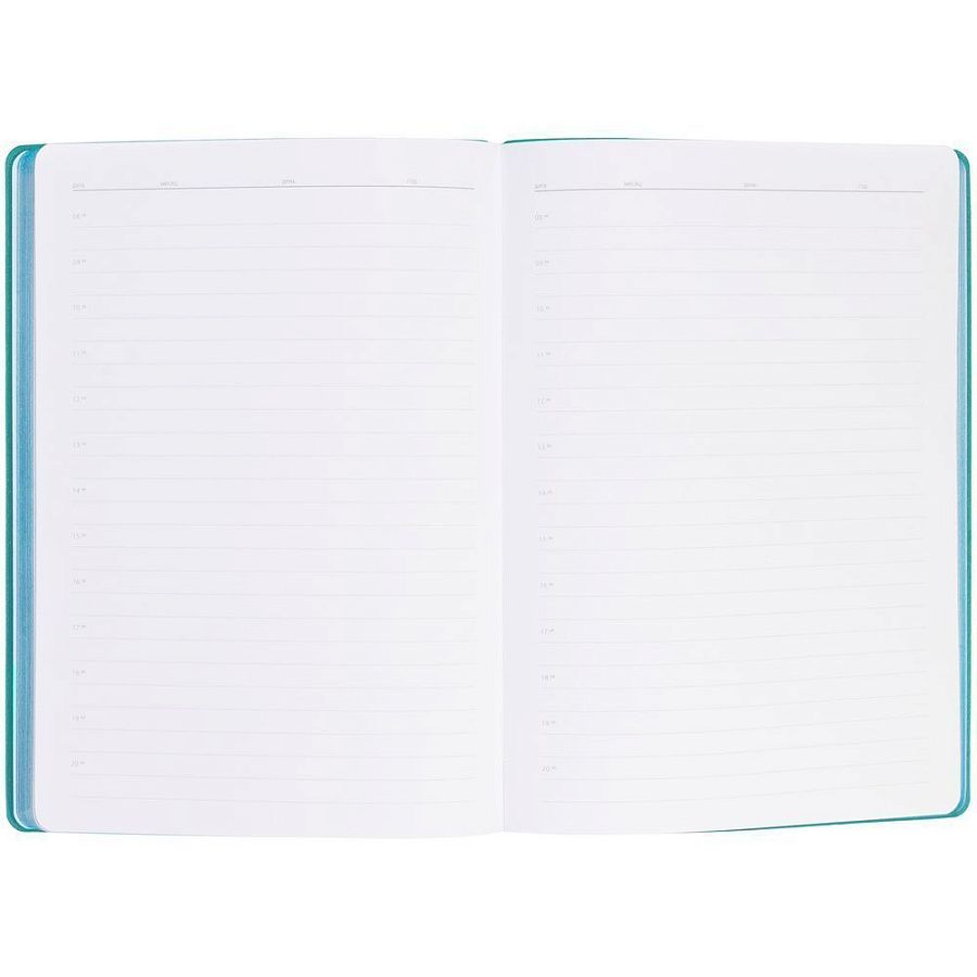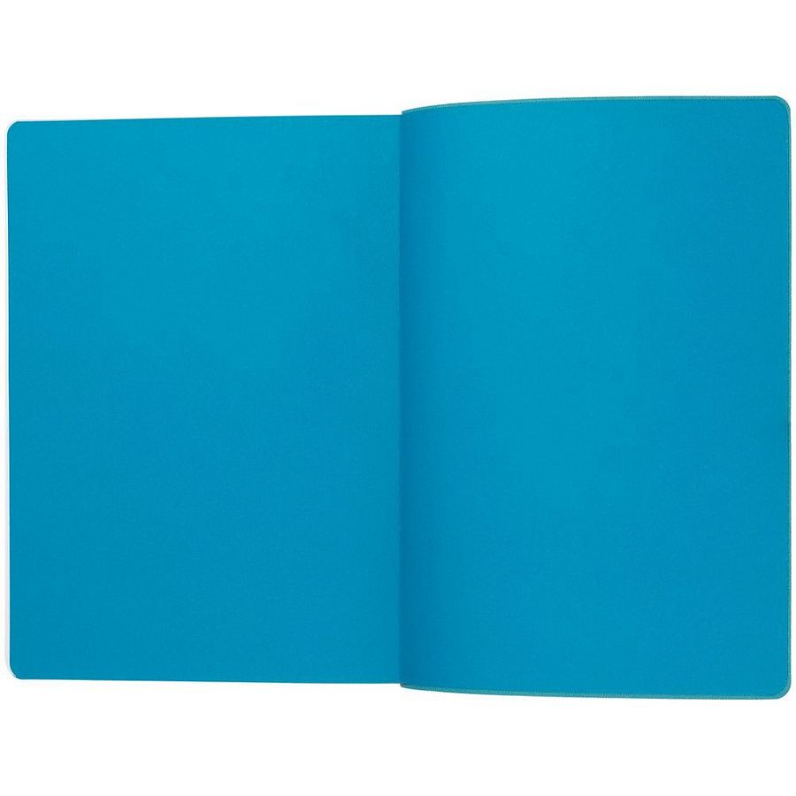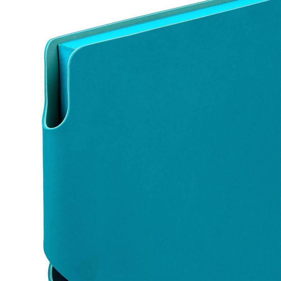 Гибкая обложка выполнена из материала Soft Touch, цвет морской волны II и Latte, цвет морской волны II (внутренняя часть обложки). Внутри корешка — специальное место для крепления ручки размером до 15х1 см.