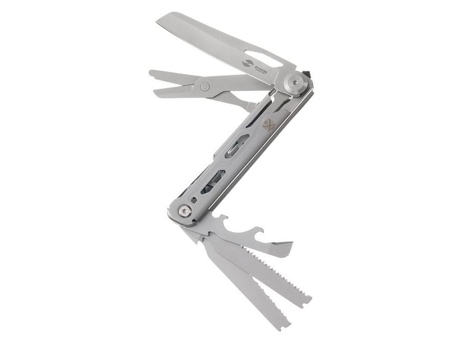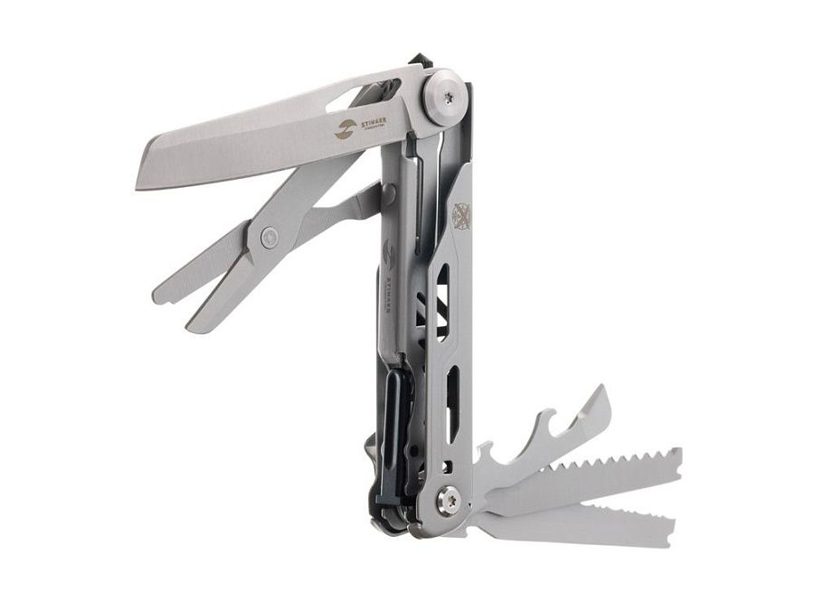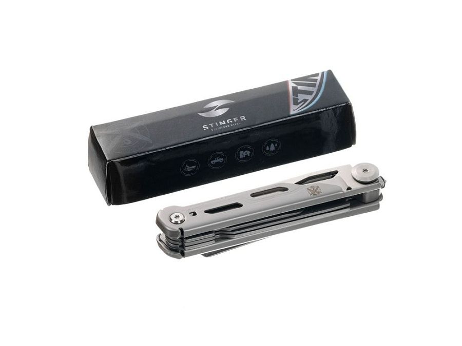 Нож перочинный STINGER имеет 9 функций: 1. Лезвие с фиксатором клинка Liner Lock 2. Ножницы 3. Пила 4. Лезвие с серрейторной заточкой 5. Открывалка для бутылок 6. Консервный нож 7. Инструмент для снятия изоляции 8. Стеклобой 9. Клип ХАРАКТЕРИСТИКИ Материалы • лезвие/инструменты: нержавеющая сталь 440A, твердость 54-58 HRC • рукоять: нержавеющая сталь 440A, твердость 54-58 HRC Размеры • Размеры ножа: 112х20х25 мм • Общая длина: 185,5 мм • Длина клинка: 79,3 мм • Наибольшая ширина клинка: 17 мм • Толщина обуха: 2,5 мм • Длина рукояти: 111,3 мм • Ширина рукояти (в ср.части): 19,4 мм • Толщина рукояти (в ср.части): 18,9 мм Вес: 141 г Цвет: серебристый Упаковка: картонная коробка