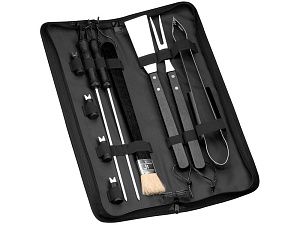 Набор для барбекю "Barabicu" из 10 предметов. Чехол с застежкой на молнии, передним открытым карманом и двумя ручками, включая лопатку, вилку, щипцы, 2 шампура, кухонную кисть и 4 держателя для кукурузы.