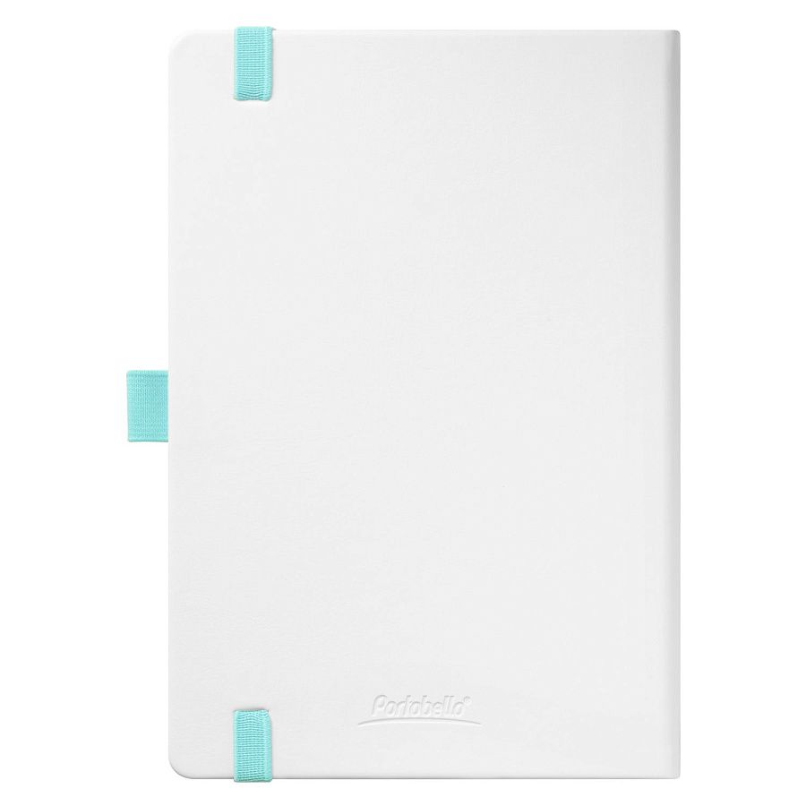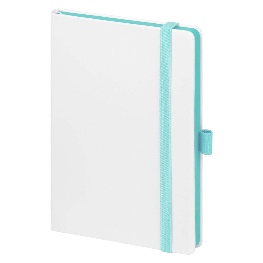 Недатированный ежедневник выполнен в жесткой обложке из искусственной кожи со скругленными уголками. Переплетный материал гладкий, с легкой естественной паутинкой морщин, имеет полуглянцевый блеск. Цвет – чистый белый. Бирюзовые матовые форзац и нахзац, а также бирюзовый срез блока создают оригинальный динамичный цветовой ансамбль и подчеркивают белизну обложки. Страницы светло-кремового цвета, из гладкого офсета, слегка шелковистые, со скругленными уголками. Добавляют изделию мягкую комфортную теплоту. Двойное атласное ляссе составлено из бирюзовой и белой лент. Каждая шириной 6 мм, имеет легкий блеск. Вертикальная фиксирующая резинка прочная, надежная и удобная, в тон срезу. Есть петелька для ручки в тон резинки. Карман на заднем форзаце.