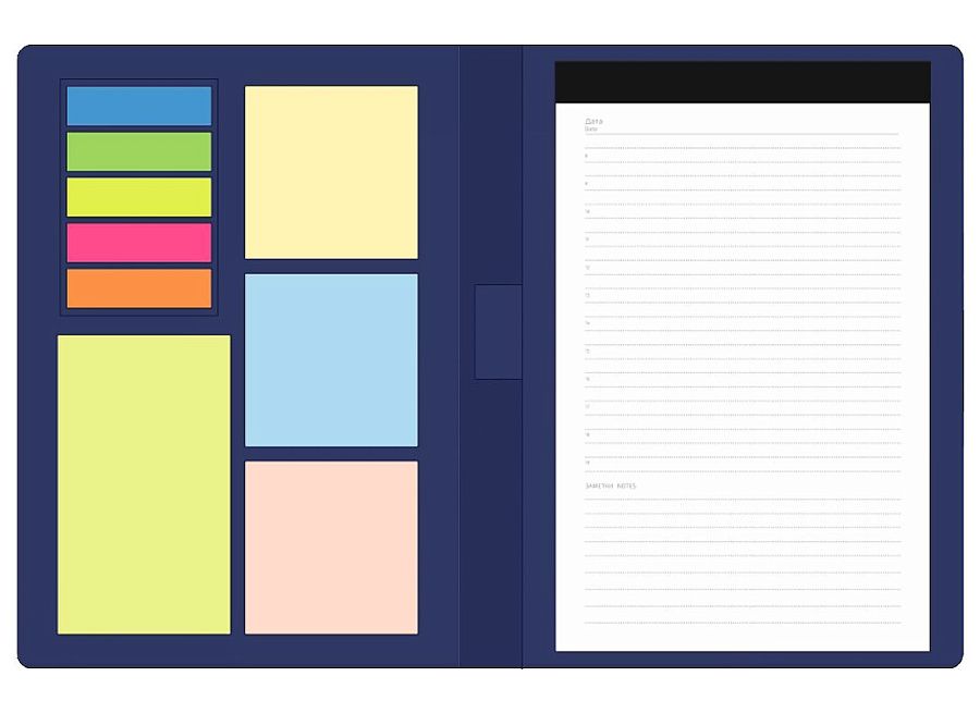 Стикеры выполнены в 3-х размерах: 3 квадратных разноцветных набора (размер: 55х55 мм), 1 набор прямоугольных (размер: 55х95 мм) и набор из 5 разноцветных закладок.