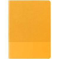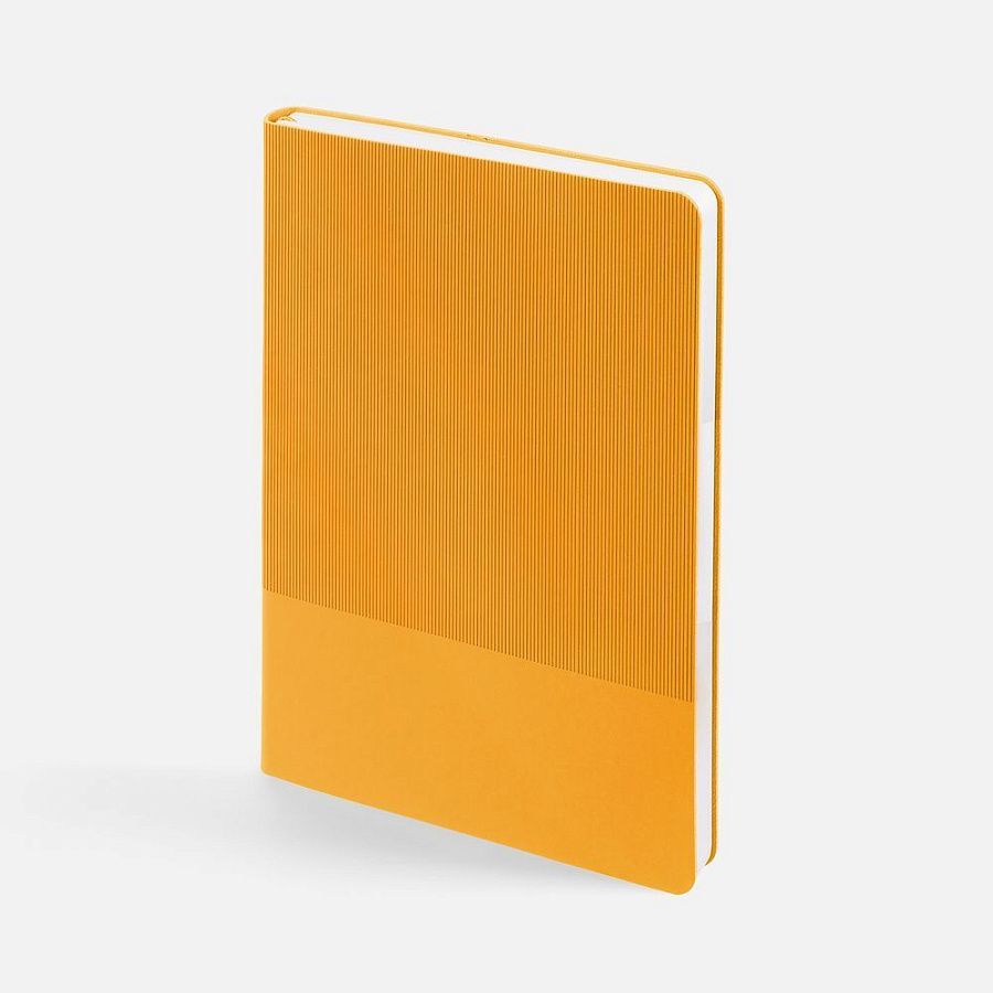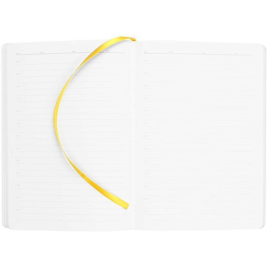 Ежедневник с гибкой обложкой выполнен из материала Soft Touch, желтый KK и Latte, желтый (внутренний материал); дополнен ляссе желтого цвета и фактурным тиснением обложки.