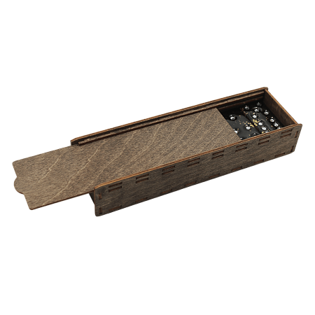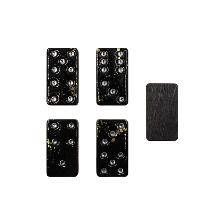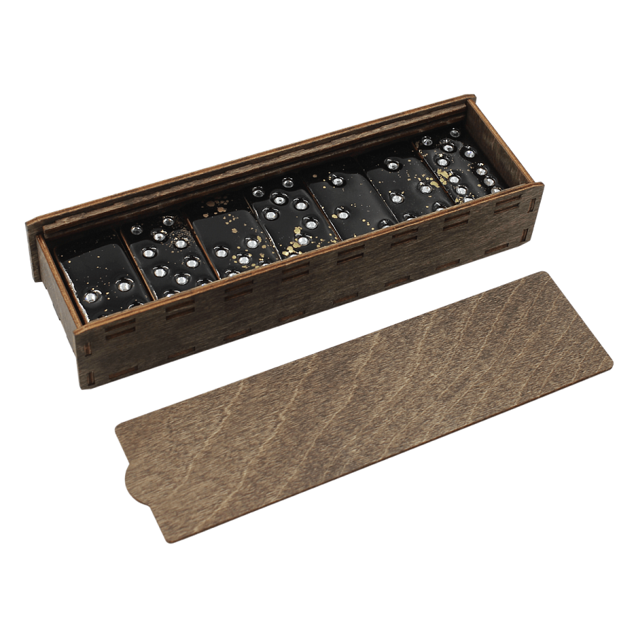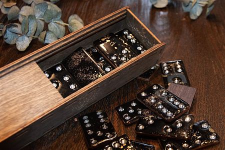 Домино WIN-WIN в стильном деревянном пенале, входит в коллекцию "Русские сезоны".Кости глянцевого черного цвета из дерева и ювелирной смолы с золотыми вкраплениями и стразами произведены вручную. Элегантный и лаконичный дизайн.