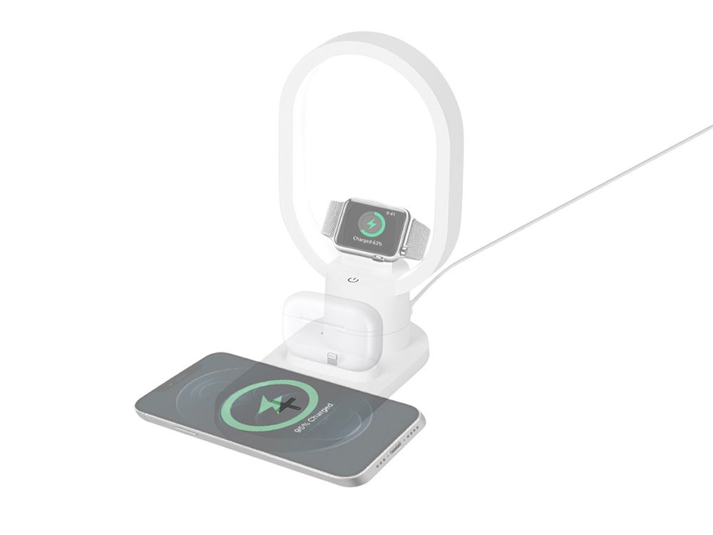 Настольная зарядная станция с лампой для трёх устройств - смартфона с поддержкой беспроводной зарядки, часов Apple и наушников Apple (разъем Lightning). Регулируемый уровень яркости (диммер). Лампу можно вращать вокруг своей оси. Для удобства транспортировки лампу можно отсоединить. • Быстрая беспроводная зарядка 15 Вт* • Одновременная зарядка 3-х устройств • Регулируемая яркость лампы • Многоуровневая интеллектуальная система защиты для безопасной зарядки *При подключении от сетевого адаптера 18 Вт