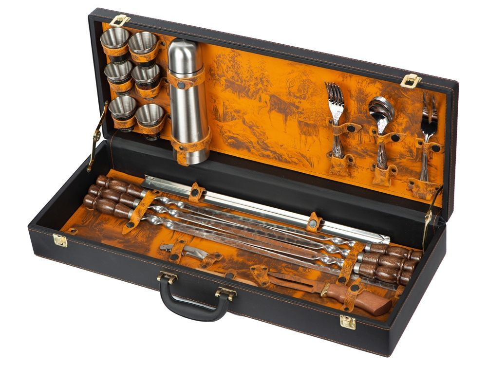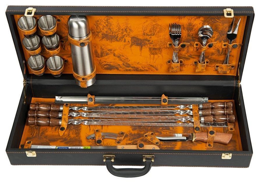 Кейс из сплит-кожи, с повышенной износостойкостью, внутренняя отделка натуральная кожа с художественным выжиганием. В комплект входит: Шампур - 6 шт. Термос 0,5л -1 шт. Стопка 70мл - 6 шт. Ложка - 6 шт. Вилка - 6шт. Вилка для мяса - 1 шт. Штопор - 1шт. Нож - 1 шт. Нож "Мачете" - 1 шт. Мангал - 1 шт.