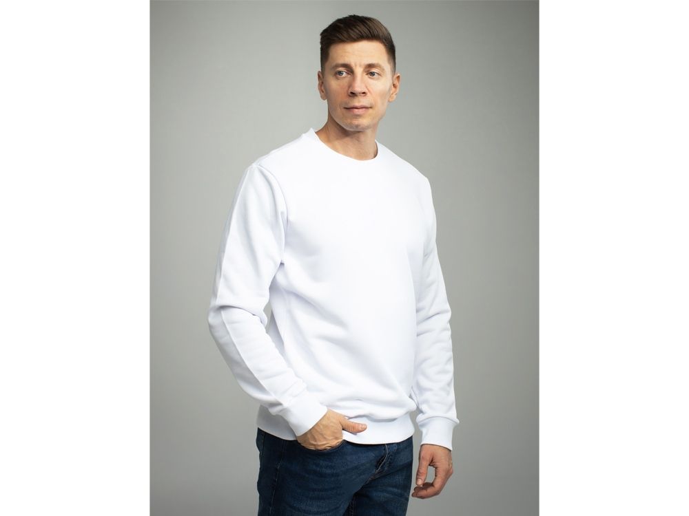 Свитшот прямого кроя с круглой горловиной и втачным рукавом. Особенности плетения полотна позволяют добиться эффекта 100% хлопка с внутренней стороны, обеспечивая гипоаллергенность и комфорт при носке, и 100% полиэстера с внешней стороны изделия, обеспечивая яркость красок нанесения и их износостойкость. Горловина, манжеты и низ зделия выполнены из полотна Кашкорсе (95% хлопок и 5% спандекс).