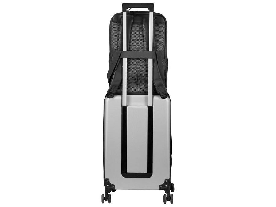 Бизнес-рюкзак из плотной ткани, хорошо держащий форму, имеет строгий и стильный дизайн. Внутри 2 отделения - для ноутбука и для одежды с органайзером и внутренним карманом на молнии. Снаружи расположено большое отделение на молнии. Рюкзак удобен для поездок, при этом компактен и оснащен ремнем для крепления к чемодану. В комплекте нетканый мешок для хранения и съемный металлический шильд для нанесения вашего логотипа.