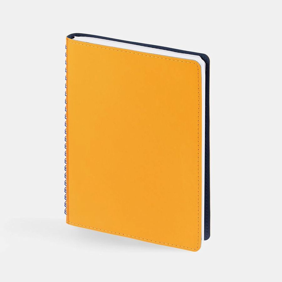 Ежедневник с гибкой обложкой, выполнен из материалов Soft Touch, желтый КК и Nice Touch, темно-синий ХХ.