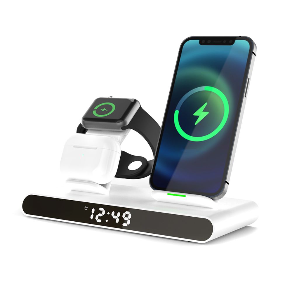 Часы электронные Abbatt мультифункциональные с беспроводной зарядкой. Особенность этих электронных часов заключается в том, что они выполянют функцию не только часов и будильника, а еще с их помощью можно заряжать свои гаджеты. Удобство беспроводной зарядки говорит само за себя - очень комфортно заряжать смартфон, часы и наушники, просто положив их на зарядную станцию, не подключая при этом к ним никаких кабелей. Также есть возможность быстрой зарядки Qi. При беспроводной зарядке устройство меньше подвержено перепадам в сети, чем при подключении к розетке, тем самым увеличивается срок службы аккумулятора. Благодаря интерфейсу Type-C (шнур идёт в комплекте 1м) ваши гаджеты будут заряжаться более эффективно, а главное - одновременно. Вы можете смотреть фильмы, слушать музыку, звонить или отправлять сообщения во время всего процесса зарядки. Входы: 9V/2A 12/2A. Выходы: Беспроводной 10W / 7.5W / 5W / USB 5V / 0.8-1A / Airpod 3W / Apple watch 2.5W. Совместимость с Apple 8 и выше.